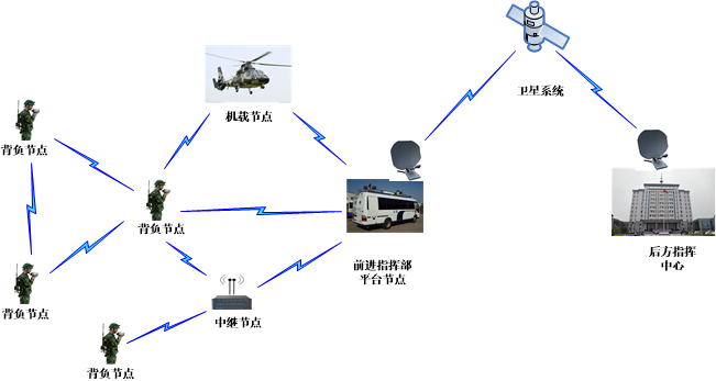 主要应用为与卫星指挥车配合,卫星车上安装卫星设备和自组网设备。卫星设备负责远距离传输,自组网设备承担现场无盲区覆盖,实现单兵到指挥车的语音、图形和数据传输。